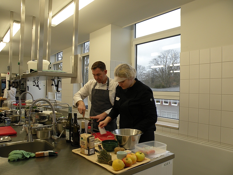 Und dann ist es endlich so weit. Es geht zur praktischen Umsetzung in die Küche. Bei der Zubereitung der 12 Gerichte wird an der einen oder anderen Stelle noch die tatkräftige Unterstützung von Volker Fuhrwerk oder den Fachlehrkräfte der EHKS benötigt.
