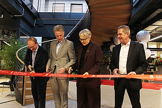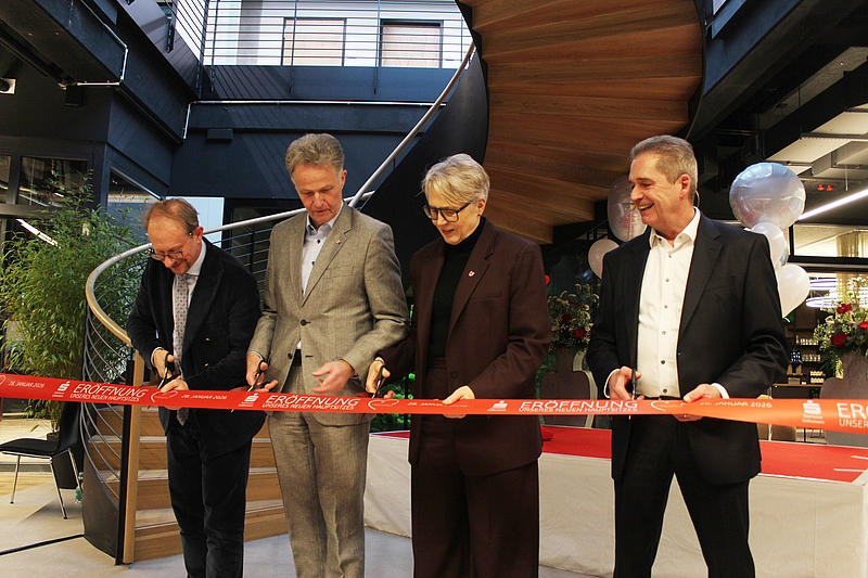 Neumünster (pm/rjs) – Mit einem symbolischen Schnitt durch das rote Band hat die Sparkasse Südholstein jetzt ihren neuen Hauptsitz am Großflecken feierlich eröffnet. Zusammen mit dem Vorstandsvorsitzenden Eduard Schlett vollzogen die Mitglieder der Verwaltungsratsspitze – Elfi Heesch, Landrätin des Kreises Pinneberg, Jan Peter Schröder, Landrat des Kreises Segeberg und Neumünsters Oberbürgermeister Tobias Bergmann – diesen offiziellen Akt. Vor rund 120 geladenen Gästen aus Politik, Wirtschaft und der Sparkassenorganisation läuteten Vorstandsvorsitzender Eduard Schlett und seine Vorstandskollegen Martin Deertz und Jürgen Hiemer ein neues Kapitel in der Entwicklung der Sparkasse Südholstein ein. Auch der Präsident des Sparkassen- und Giroverbands für Schleswig-Holstein, Oliver Stolz, sprach ein Grußwort und lobte den neuen Hauptsitz als beispielhaft für das traditionelle und zugleich innovative Engagement der Sparkassen für die Gesellschaft.