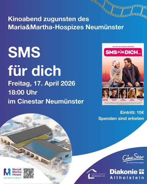 Neumünster (pm) - Am Freitag, den 17. April 2026 um 18 Uhr erwartet im CineStar Neumünster die Besucher*innen ein Kinoabend mit Herz. Die Diakonie Altholstein lädt in Kooperation mit dem Kino zu einem besonderen Benefiz-Event im Rahmen einer Filmreihe ein. Der Abend steht ganz im Zeichen der Unterstützung für das geplante Maria&Martha-Hospiz in Neumünster-Einfeld.