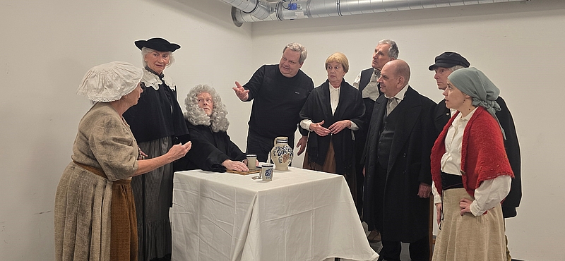 Neumünster (dws) – Als Heinrich von Kleist 1806 den „Zerbrochenen Krug“ schrieb, ahnte er nicht, dass seine Komödie einmal auf Plattdeutsch in Neumünster aufgeführt werden würde. Op Platt heet dat Stück nu: „Dat Schörengericht“. Es geht um einen Richter (gespielt von Dieter Milkereit), der lügt, dass sich die Balken biegen, um seinen Kopf und guten Ruf zu retten, einen kaputten Krug und jede Menge plattdeutscher Schlagfertigkeit. Die NBN probt derzeit den Klassiker, der aktueller nicht sein könnte. Es geht um Recht und Gerechtigkeit und die Frage, wie lange hält eine Maske stand, bevor sie, ähnlich wie der Krug, in tausend Teile zerbricht? Es lohnt daher, einmal einen Blick hinter die Kulissen zu werfen und ein bisschen „Theaterluft“ zu schnuppern. Schauspieler und Soufleuse sind versammelt, es wird gelacht und der Text noch einmal überflogen. Die Inspizientin Karin Parton-Löhndorf sorgt dafür, dass alle Requisiten vorhanden sind. „2007 haben wir das Stück schon einmal gespielt, ich war damals die „Frau Brigitte“, es war meine erste Rolle bei der NBN“ erzählt Ellen Hansen und zeigt ein altes Programmheft, das alle bestaunen. „Heute spiele ich wieder „Frau Brigitte“, fügt Ellen Hansen stolz hinzu und passt in ihrem schwarzen Kostüm perfekt in die damalige Zeit. Alle Darsteller proben in historischen Kostümen, die sie später auch auf der Bühne tragen. Das hilft, sich besser und schneller mit der Figur, die sie spielen, zu identifizieren. Der große Fundus birgt genug Kleidung und Perücken für alle.