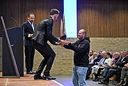 Bad Bramstedt (usp) – „De Gill schall leben“. Pfingstzeit gleich Gildezeit. Wie in jedem Jahr war wieder der Begrüßungsruf der Fleckengilde von 1560 in vielen Bereichen der Stadt zu hören. Dieses Jahr vermischte sich dieser Ruf allerdings mit einer Begrüßung, die letztmalig im Jahr 2022 in Bad Bramstedt zu hören war: „Dzien dobry“. Nach drei Jahren der „Abstinenz“ besuchte eine siebenköpfige Delegation der polnischen Partnerstadt Drawsko Pomorski den Ort – und tauchte erstmalig in die Tradition der Fleckensgilde ein. Der Besuch gab den beiden Bürgermeistern, Krzytof Czerwinski aus Drawsko und Felix Carl, der sein Amt im Februar angetreten hatte, Gelegenheit, sich persönlich kennenzulernen. Von „fremdeln“ keine Spur. Als kennten sie sich seit Jahren und hätten sich gestern zum letzten Mal gesehen, gingen die beiden Stadtoberhäupter miteinander um, genauso der Rest der Delegation und die anderen Gastgeber aus Stadt und Verwaltung. Man konnte deutlich spüren, dass es ein Treffen unter Freunden war. Ziel von Czerwinski und Carl ist es, die über Jahrzehnte gewachsene Freundschaft wieder zu intensivieren und auszubauen. Die Gastgeber hatten, gestützt auf das „Amt zum Glück“, ihren Gästen ein interessantes und abwechslungsreiches Programm vorbereitet. Darauf standen unter anderem die Bramstedter Kliniken und der Wildpark Eekholt. „Wir freuen uns, die polnischen Freunde an unseren Traditionen teilnehmen lassen zu können“, hatte Bürgermeister Carl im Vorwege des Besuchs verlauten lassen. Und so nahmen sie an den meisten Programmpunkten der Fleckensgilde teil. Ein wesentlicher Punkt im Programm der Gilde ist es, den neuen Jüngsten, der durch den Vorstand auserkoren wurde, beim abendlichen Kommers bekannt zu geben. In diesem Jahr löst Martin Tolzien den bisherigen Jüngsten Florian Schiefer ab, der als erster Jüngster eine Stufe in der Gildehierarchie aufrückt. „Ich bin nicht überrascht aber stolz, ein bisschen von der Tradition weitergeben zu dürfen“, freute sich der frisch gebackene Jüngste, der 41 Jahre alt ist und beruflich Geschäftsführer einer Industrievertretung für Sanitär, Heizung und Klima ist. Am Morgen hatten die Polen miterlebt, wie der Öllermann Thorsten Ehlers von Bürgermeister Carl den Schlüssel für das Rathaus übergeben bekam, sozusagen als Zeichen der Machtübernahme – für einen Tag. Anschließend hatte Gildemeister Ansgar Schroedter den Gildebefehl an den Bürgermeister verlesen mit dem Auftrag „to verkloren, wat eem so infallt, de Fleckensgill und Bramstedt na Vörn to bringen“. Für den Bürgermeister eine Denksportaufgabe, deren Lösung er abends beim Kommers vorzutragen hat – natürlich op platt. Im Gegensatz zu vielen anderen Befehlen früherer Jahre war es keine konkrete Aufgabe, wie beispielsweise das Pflanzen von Bäumen, die Felix Carl zu lösen hatte. Mit einem „Idee-Potpourri“ löste Carl die Aufgabe zur Zufriedenheit der Gildeoberen und der Gäste. Stichwort Verkehr: Fahrräder und Auto sollen nebeneinander Platz in der Stadt finden, Gewerbeflächen und Wirtschaftsförderung in der Innenstadt. Neue Brücken zu bauen, das wurde deutlich, ist dem Bürgermeister nicht nur im übertragenen Sinne ein Anliegen. Außerdem sollte die Stadt vorbereitet sein auf nachhaltige Energie und Katastrophenfälle. Zusätzlich setzt Carl auf die Zusammenarbeit der Kommunen. Und auch Kultur und der Freizeitwert soll erhöht werden. „Jeder findet in der Stadt einen Platz“, wünscht sich der Bürgermeister. Die Gilde sieht er auch in Zukunft als Bewahrer für die Geschichte und die Werte im Sinne der Identität mit der Stadt. Beim Tanz um den Roland, der immer vor dem Kommers im Kaisersaal stattfindet, hatte der Wettergott zum Glück ein Einsehen mit der Festgesellschaft. Dort konnte sich auch die Gäste aus Polen aktiv einbringen, während Agatha Schuster aus Bad Bramstedt und Daniel Puchalski aus Polen kaum eine Chance hatten, das Geschehen aus dem Plattdeutschen ins Polnische zu übersetzen. Der Ursprung des Brauches um den Roland zu tanzen, ist zurückzuführen auf die Befreiung des Fleckens Bramstedt und seiner Bewohner aus der Leibeigenschaft des Grafen von Kielmannsegg im Jahr 1685. Dabei wurde festgelegt, dass, jedes Jahr zu Pfingsten, wenn die Sonne untergeht, in Erinnerung an diese Gemeinschaftsleistung um den Roland getanzt werden soll.
