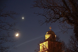 Über der Vicelinkirche in Neumünster sind die Mondsichel und die Venus gut zu erkennen. © Marco Ludwig