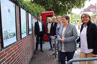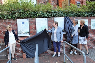 Itzehoe (bg) – Mit einer feierlichen Enthüllung wurden die neuen Schilder offiziell eingeweiht. An der Wand zum Kirchhof der St. Laurentii-Kirche, direkt neben der Telefonzelle, informieren sie nun Einheimische wie Besucher über den Mönchsweg, die Kirche und die Stadt Itzehoe.