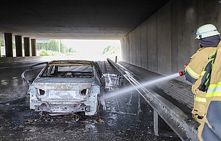Bad Bramstedt/A7 (fs) - Ein BMW ist am heutigen Sonnabendvormittag, 27. September, auf der A7 zwischen Bad Bramstedt und Kaltenkirchen in Richtung Süden in Brand geraten. Da das Fahrzeug direkt unter einer Brücke brannte, hatte der Rauch auch die Sicht auf der Gegenfahrbahn behindert. In beiden Richtungen kam es zu einem langen Rückstau. Die Feuerwehr ist mit einem Großaufgebot im Einsatz und hat das Auto abgelöscht. Richtung Norden ist die Fahrbahn bereits wieder frei. Foto: Sprenger