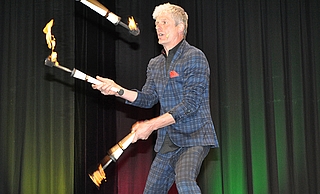 Für viel Lacher und auch Bewunderung sorgte der Hamburger Komiker und Artist Jens-Ohle. „Das war kein Applaus, das war Mitleid“, begrüßte er die Gäste beim Betreten der Bühne, die dann für „richtigen“ Applaus sorgten. Bewunderung fanden das Besteigen einer gut drei Meter hohen, freistehenden Leiter, das Jonglieren mit Bällen, Fackeln und Schwertern durch den 58-Jährigen. Außerdem verstand er es, mit viel Witz, Charme und Spontaneität das Publikum immer wieder einzubinden, ohne dabei jemanden auf die „Füße zu treten“. Die Gäste dankten ihm seinen Auftritt mit verdientem Applaus für eine grandiose Unterhaltungseinlage.