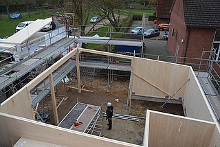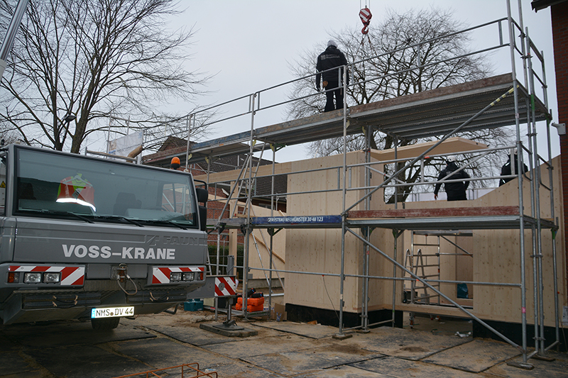 Am Dienstag wurden schwere Holzplatten, die in Schweden von der Firma Stora Enso gefertigt und von der Firma Holzbau Hauschildt aus Groß-Kummerfeld in Rostock abgeholt wurden, angeliefert – und es wurde auch gleich mit dem Aufbau und der Montage begonnen.
