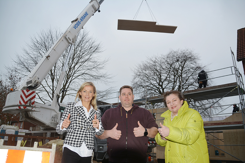 Bad Bramstedt (hot) – Ein großer Kran, der Holzplatten hievt, mehrere Lkw und Handwerker, die mächtig am Werkeln sind: Auf der Baustelle hinter dem Jugenzentrum tut sich was! Im Mai vergangenen Jahres war der erste Spatenstich für den Anbau des neuen Jugendcafés am Jugendzentrum. Nun nimmt der Bau Fahrt auf.