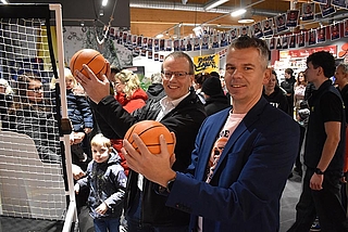 Michael Reuter von Edeka Frauen (l.) und Bürgermeister Ralf Hoppe warfen einige Bälle. © Itzehoe Eagles