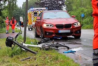 Eine Autofahrerin, die mit ihrem BMW Cabrio in dieselbe Richtung unterwegs war, konnte den schweren Zusammenstoß nicht mehr verhindern. Der Fahrradfahrer prallte bei dem Aufprall gegen die Windschutzscheibe des Kleinwagens und fiel zu Boden.