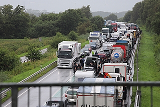 Der Wackenanreiseverkehr ist im Kreis Steinburg bereits deutlich zu spüren. Die B5 zwischen Heiligenstedten und Bekdorf war bereits in beiden Richtungen zum Stillstand gekommen. Gleiches war auf der A23 zwischen den Anschlussstellen Itzehoe- Süd und Itzehoe- Mitte. Auch hier kam der Verkehr nur schleppend voran. Foto: Sprenger