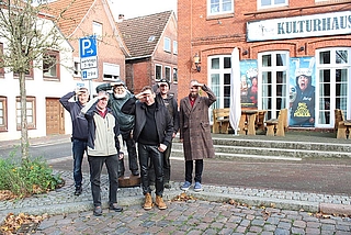 Haben die Lütt Wiehnacht fest im Blick (v. l): Andreas Richeling von der Freiwilligen Feuerwehr, Ralf-Dieter Beimgraben vom Regionalverein Wilstermarsch, Marschmensch Piet, Olaf Reese und Hinnerk Kock vom Gewerbe- und Verkehrsverein sowie Daniel Kötter von der Wilstermarsch Service GmbH. © Görke