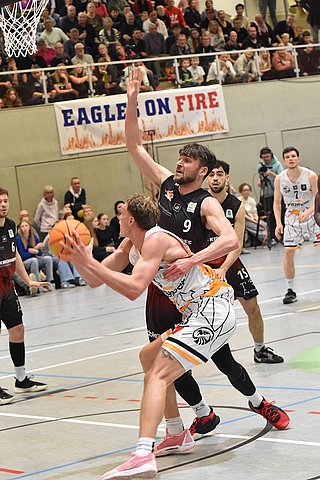 Offensiv gab es immer wieder gelungene Aktionen, aber keine Konstanz. Die Eagles verloren einige Male ärgerlich den Ball und trafen zu wenig, auch von der Freiwurflinie: Alan Kikwaki und Erik Nyberg lieferten zwar eine perfekte Quote bei 17 Versuchen, doch der Rest des Teams vergab 10 von 15 Chancen. Im zweiten Viertel drohten die Gastgeber bereits zurückzufallen, schlossen aber, angetrieben durch gute Aktionen von Jerrik Hennig, wieder bis auf wenige Punkte auf, um dann doch zur Halbzeit mit 35:50 zurückzuliegen.